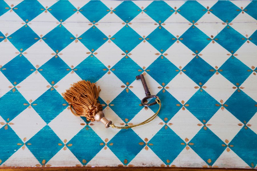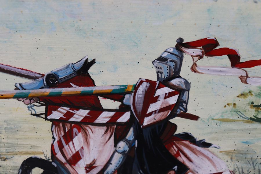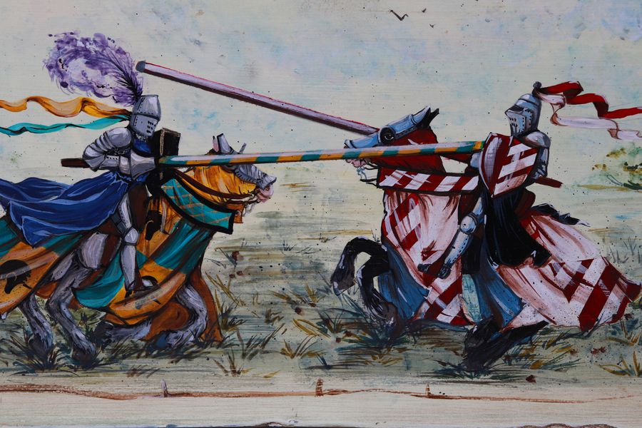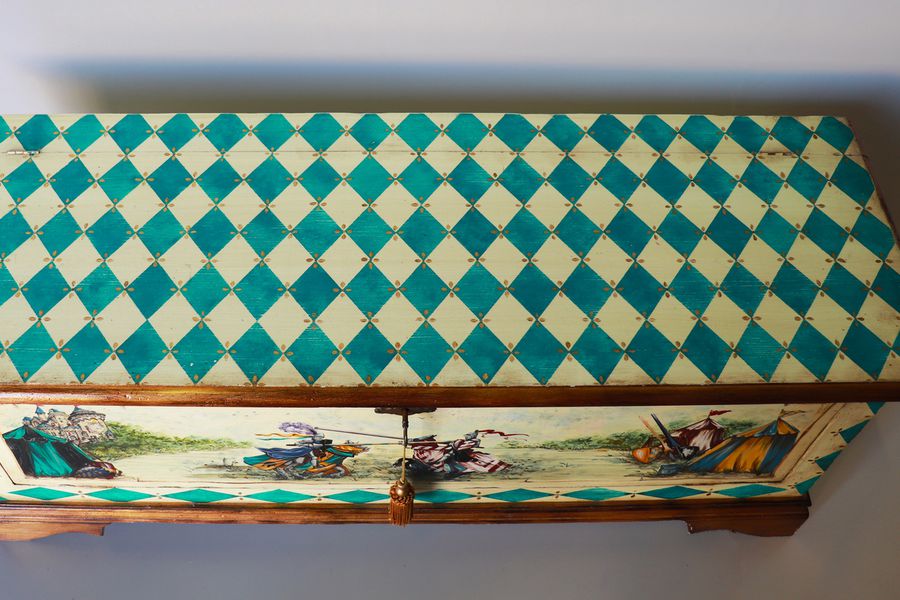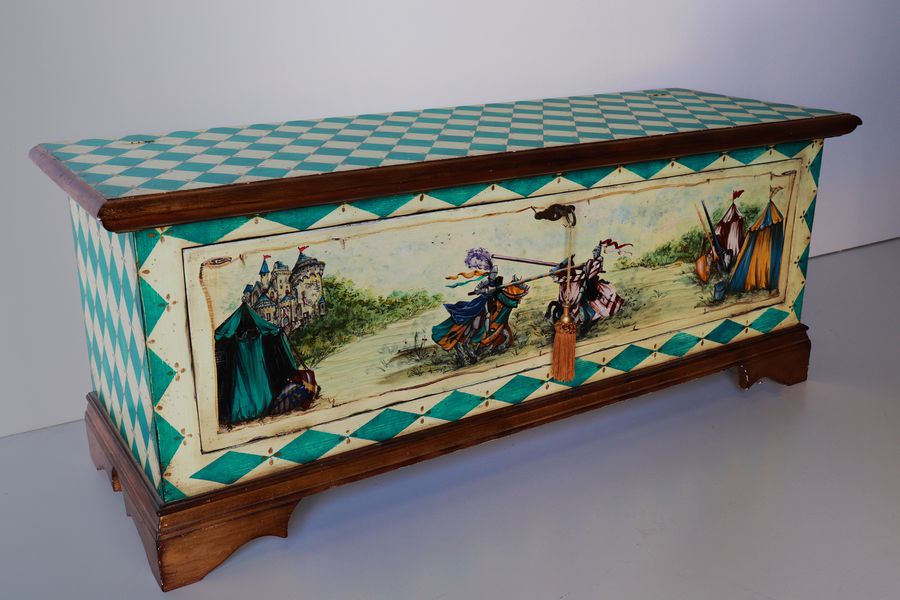 Cassapanca di ispirazione medievale con finitura anticata. Possiamo effettuare questo tipo di decorazioni su tutti i tipi di legno e con vari colori.